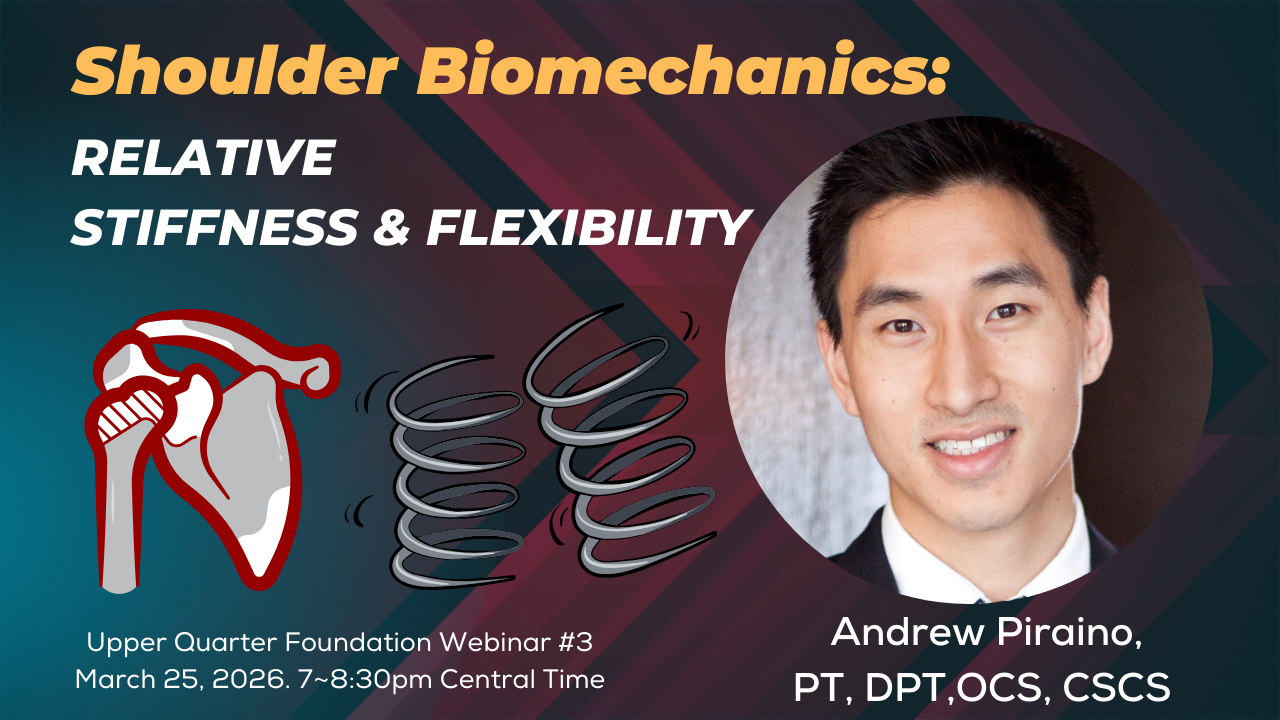 During this webinar, key concepts regarding shoulder girdle biomechanics and the relationship to kinesiopathology of the cervical, glenohumeral, and elbow regions will be discussed.